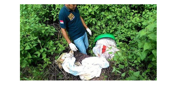 Korban yang sudah lemas kemudian dibungkus dengan tiga sprei dan dimasukkan ke dalam tong sampah plastik warna hijau dan ditutup.